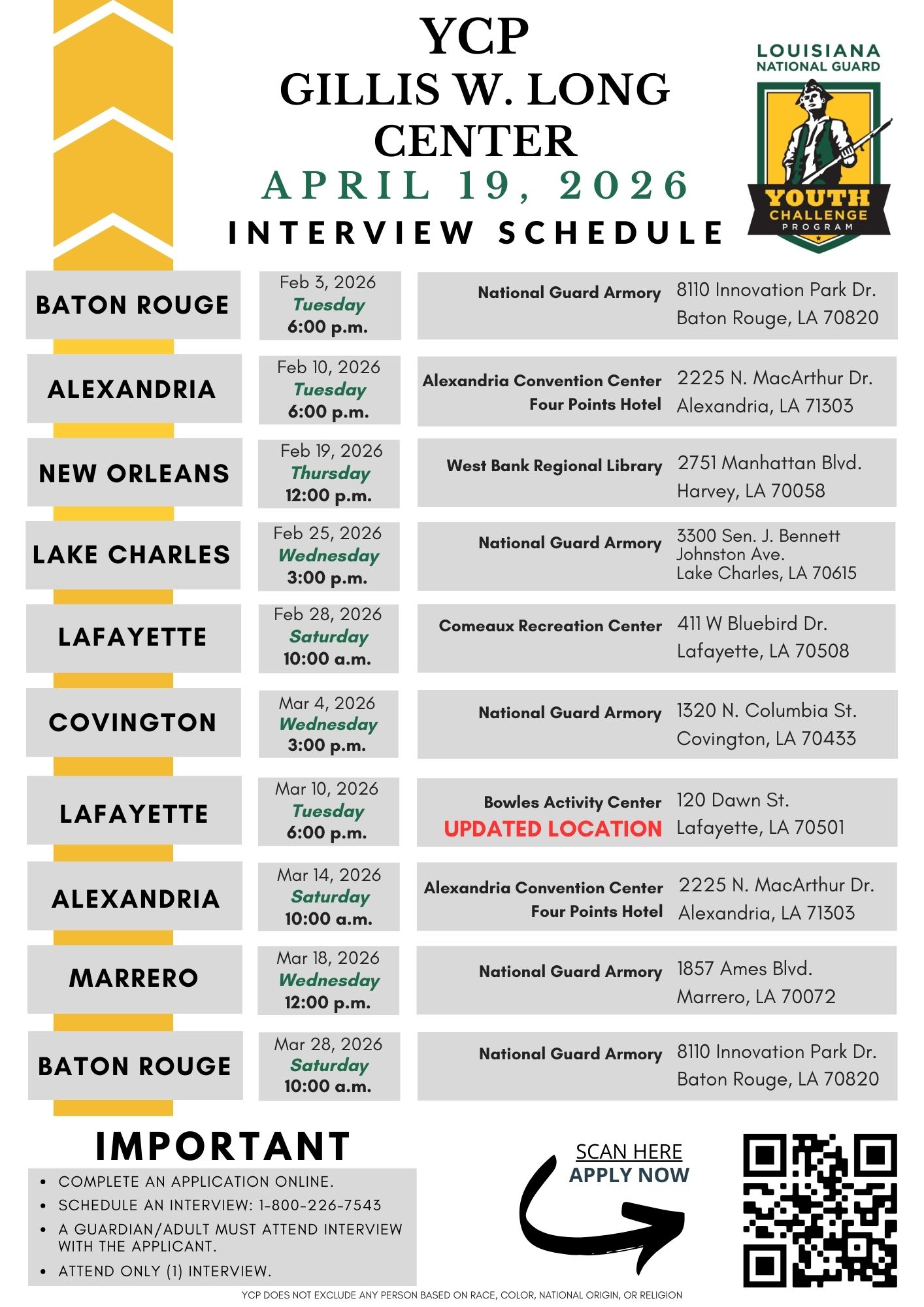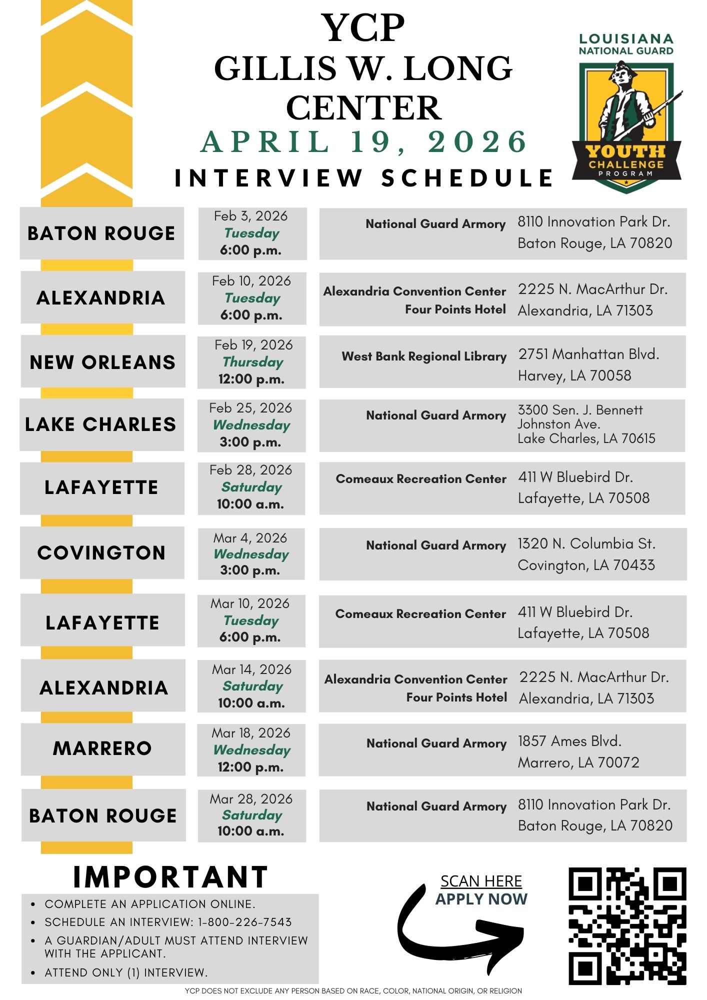 The Louisiana National Guard Youth Challenge Program (YCP) is a FREE alternative educational program that offers adolescents an opportunity to change their futures. Students looking for a way to succeed outside of a traditional school setting learn self-discipline, leadership, and responsibility while working to obtain a high school equivalency diploma.